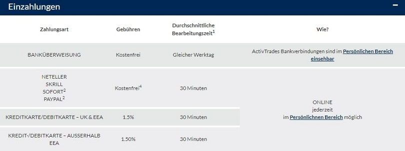ActivTrades Einzahlungsmethoden (+ Abhebungen)
