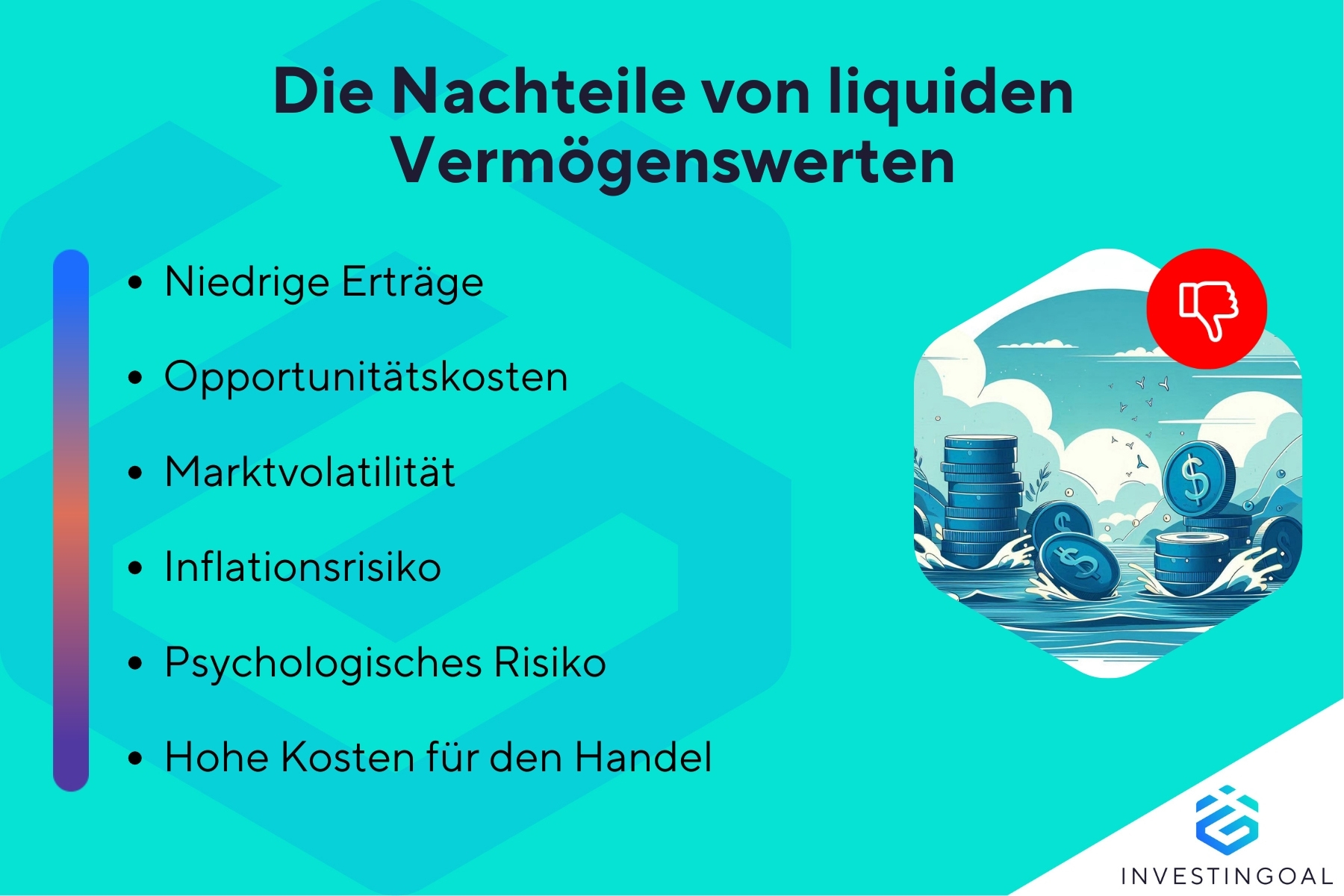Zu den Nachteilen von liquiden Vermögenswerten gehören geringere Renditen, verpasste Chancen, Inflationsrisiko, Anfälligkeit für Marktschwankungen und die Versuchung zu Impulskäufen.